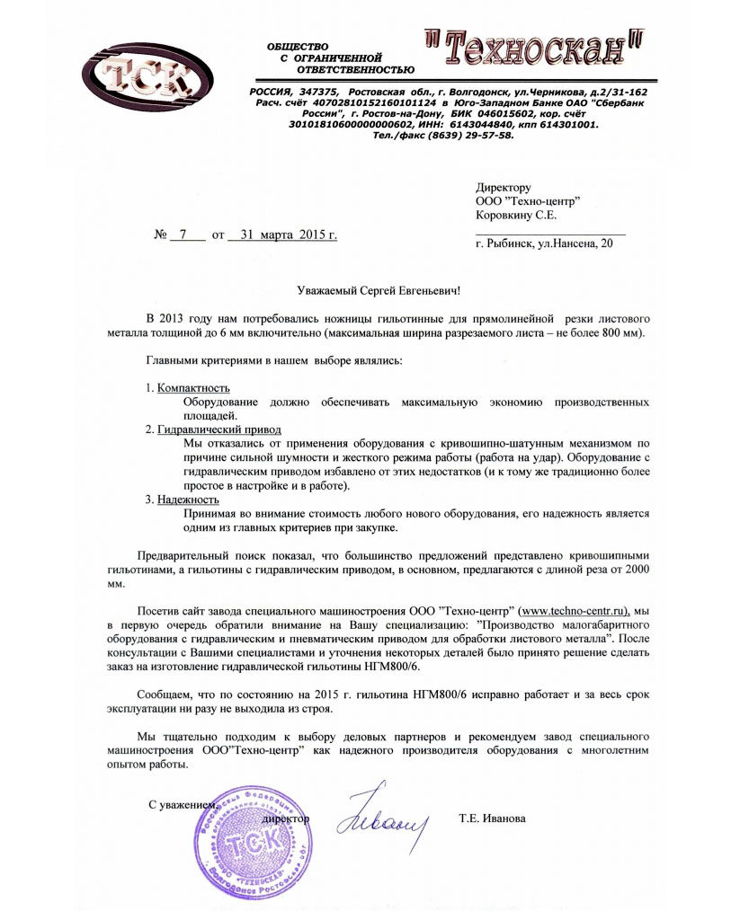 Посетив сайт завода специального машиностроения ООО «Техно-центр» (www.techno-centr.ru), мы в первую очередь обратили внимание на Вашу специализацию: «Производство малогабаритного оборудования с гидравлическим и пневматическим приводом для обработки листового металла». После консультации с Вашими специалистами и уточнения некоторых деталей было принято решение сделать заказ на изготовление гидравлической гильотины НГМ800/6.