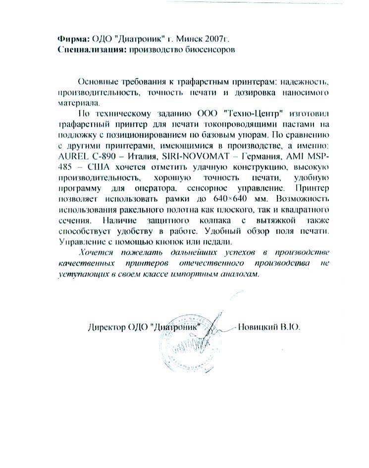 По техническому заданию ООО «Техно-центр» изготовил трафаретный принтер для печати токопроводящими пастами на подложку с позиционированием по базовым упорам. По сравнению с другими принтерами, имеющимися в производстве, а именно: AUREL C-890 – Италия, SIRI-NOVOMAT – Германия, AMI MSP – 485 – США хочется отметить удачную конструкцию, высокую производительность, хорошую точность печати, удобную программу для оператора, сенсорное управление.