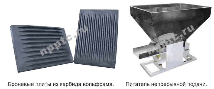 ** В стандартный комплект поставки входят щеки из стали 9ХС (установлены в дробилку), приемная емкость и пульт управления.
