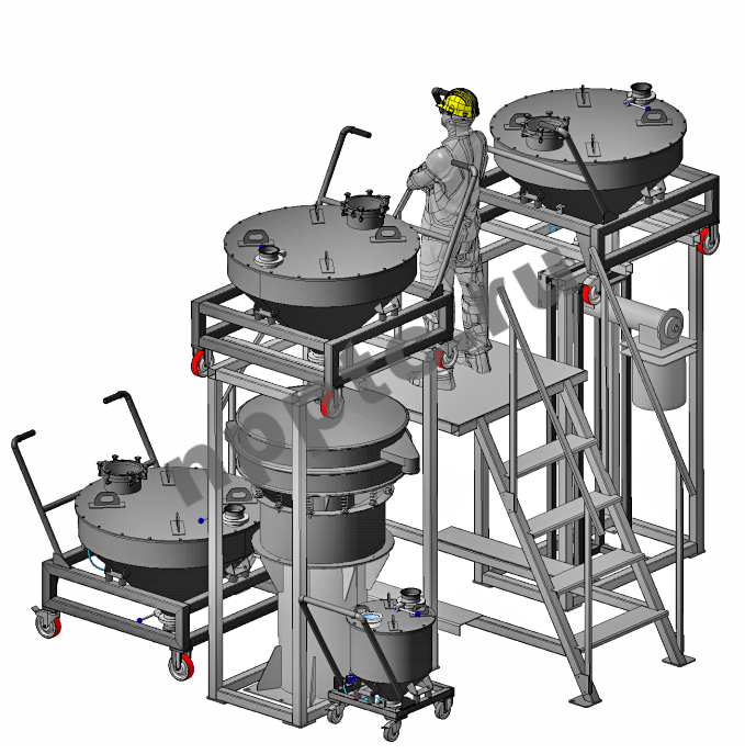 Предназначены для транспортировки и хранения различных порошков в среде инертного газа, подъема и герметичной подачи порошков между технологическими операциями и сбора готовых порошков.