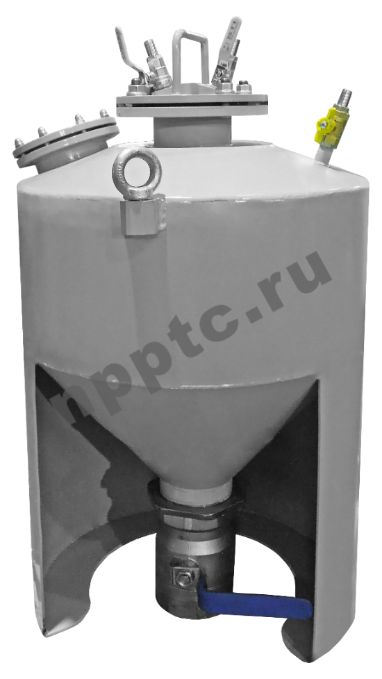 Конструктивное исполнение емкости, объем, материал изготовления, диметр люка для загрузки и выгрузки порошка, угол конуса, диаметр колесных опор и другие параметры определяются после выяснения физико-механический свойств порошков / суспензий.