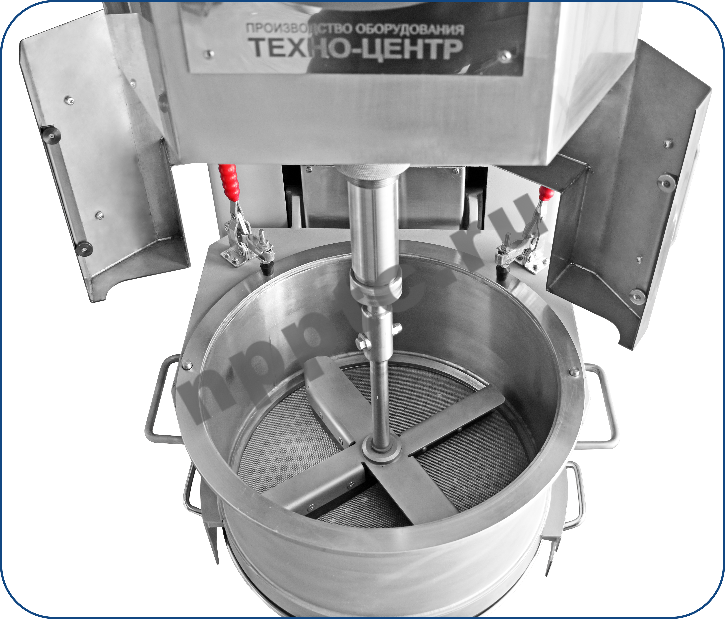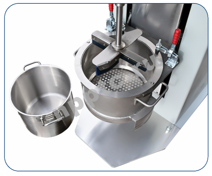 - Механизмом подъема/опускания (лифтовый механизм) позволяет облегчить съем наполненной емкости - наполненная протертым материалом приемная емкость может иметь значительный вес и поэтому ее отсоединение от рабочей емкости необходимо выполнять у пола.