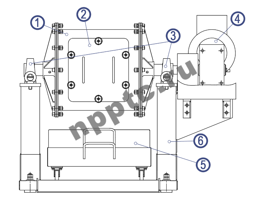 Шаровая мельница двухопорная представляет собой массивную станину (6), в верхней части которой в двух подшипниковых опорах (3) установлен вращающийся цилиндрический барабан (1), а также на отдельной площадке мотор-редуктор (4). Через люк (2) в барабан мельницы загружаются шары и материал для измельчения.