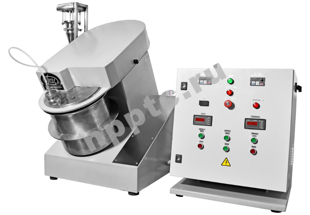 - Выгрузка готовой смеси осуществляется с помощью механизированного поворота смесительной емкости на моделях свыше 10 литров загрузки. На смесителях объемом от 10 литров и менее, емкость для выгрузки снимается вручную.