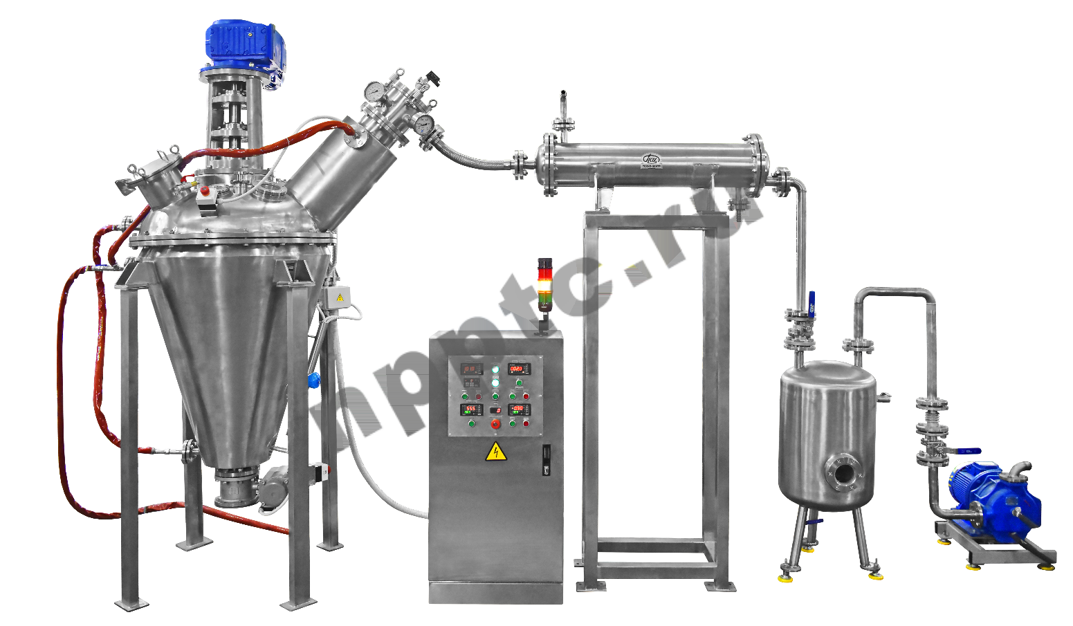 ** Расчет мощности зависит от удельного веса материала, максимальной температуры нагрева жидкого теплоносителя, глубины вакуума, необходимости в использовании чиллера для конденсатора и других сопутствующих узлов оборудования. В характеристиках указана мощность мотор-редуктора вращения конусной мешалки.